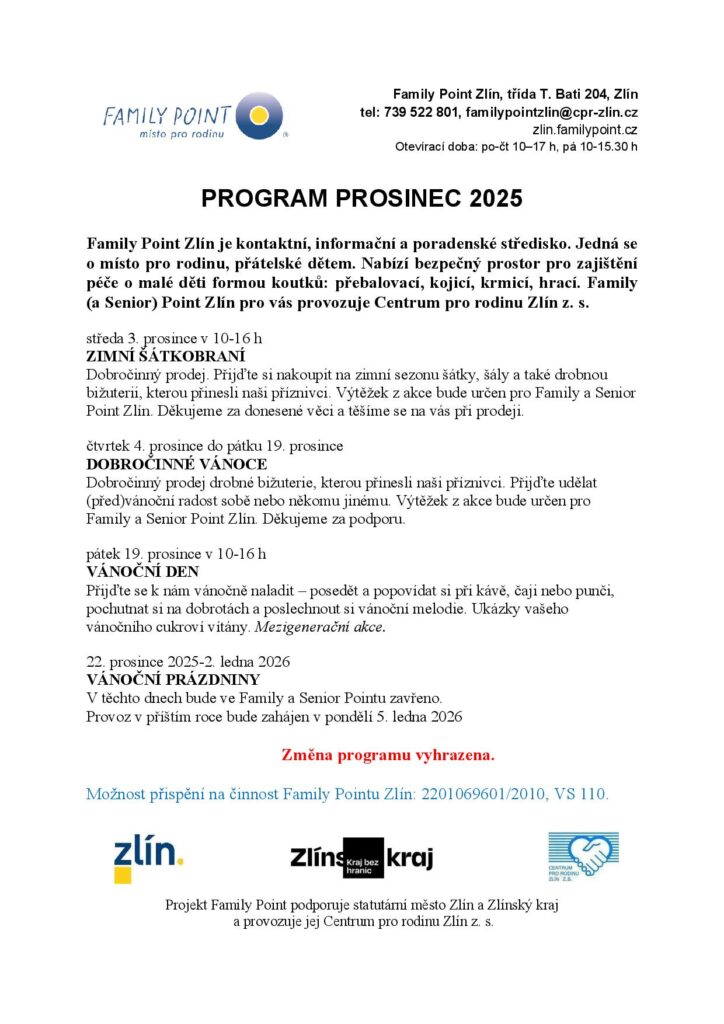 Programová nabídka Family Pointu Zlín na měsíc prosinec 2025.